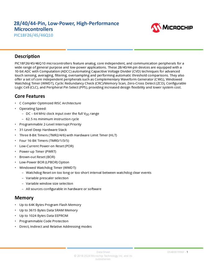 PIC18F26/45/46Q10 28/40/44-Pin, Low-Power, High-Performance Microcontrollers