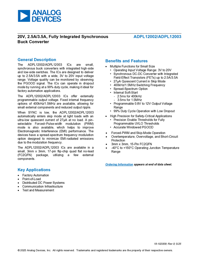 ADPL12002 20V, 2.5A/3.5A, Fully Integrated Synchronous Buck Converter