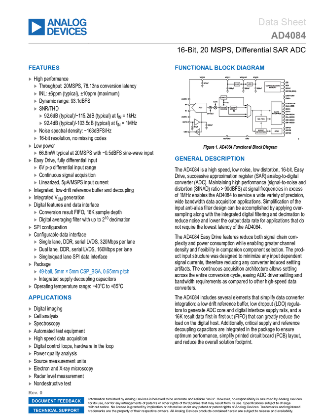 AD4084 16-Bit, 20 MSPS, Differential SAR ADC