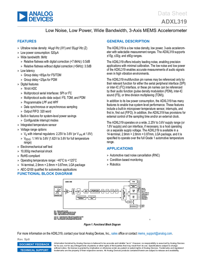 ADXL319 Low Noise, Low Power, Wide Bandwidth, 3-Axis MEMS Accelerometer