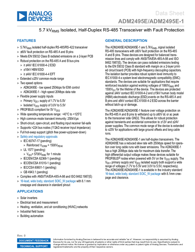 ADM2495E-1 5.7 kV Isolated, Half-Duplex RS-485 Transceiver with Fault Protection