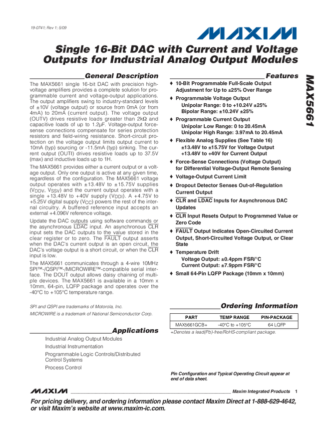 MAX5661 Single 16-Bit DAC with Current and Voltage Outputs for Industrial Analog Ou...