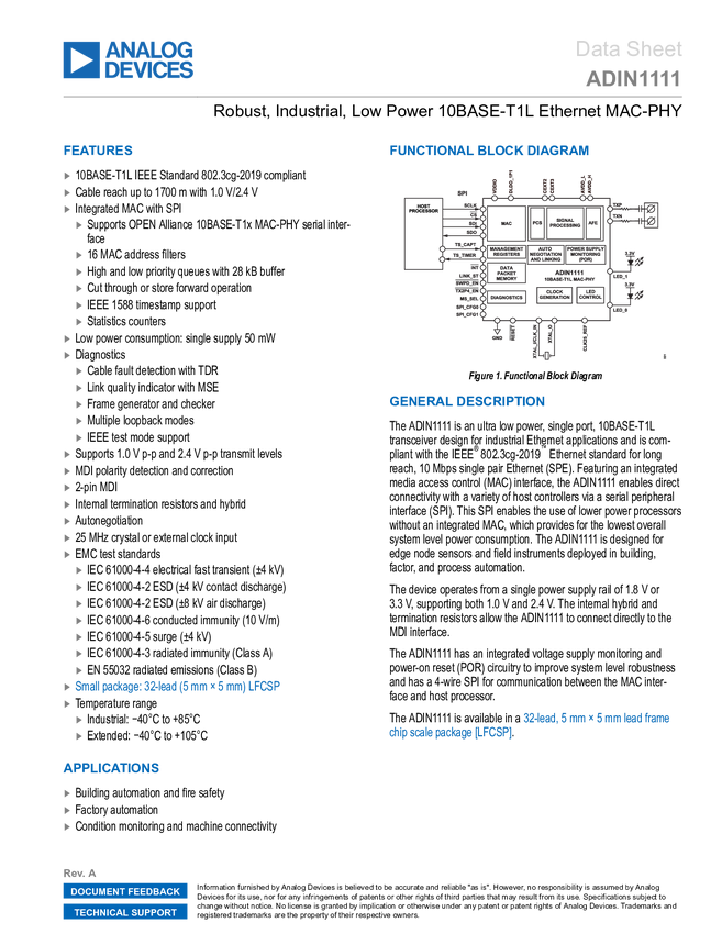ADIN1111 Robust, Industrial, Low Power 10BASE-T1L Ethernet MAC-PHY