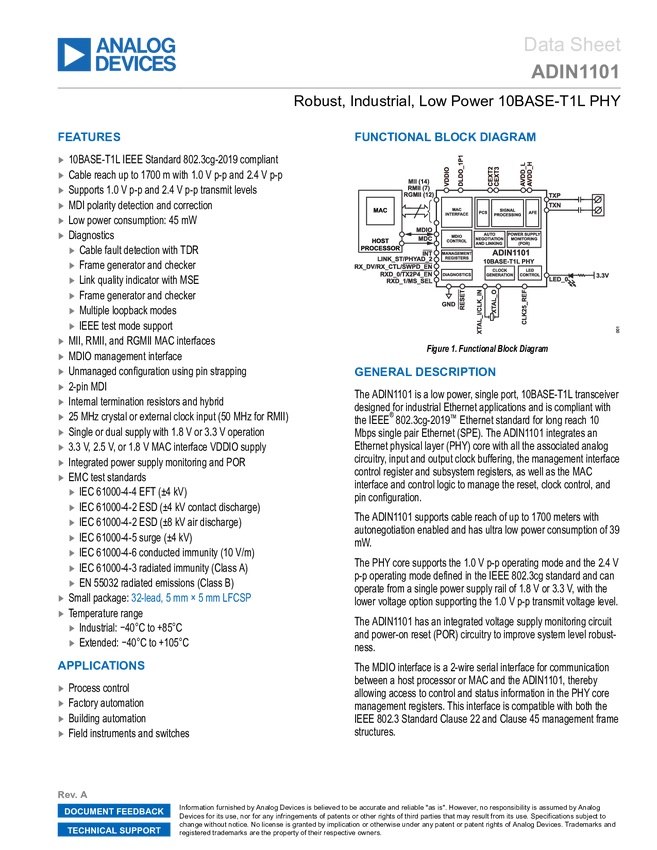 ADIN1101 Robust, Industrial, Low Power 10BASE-T1L PHY