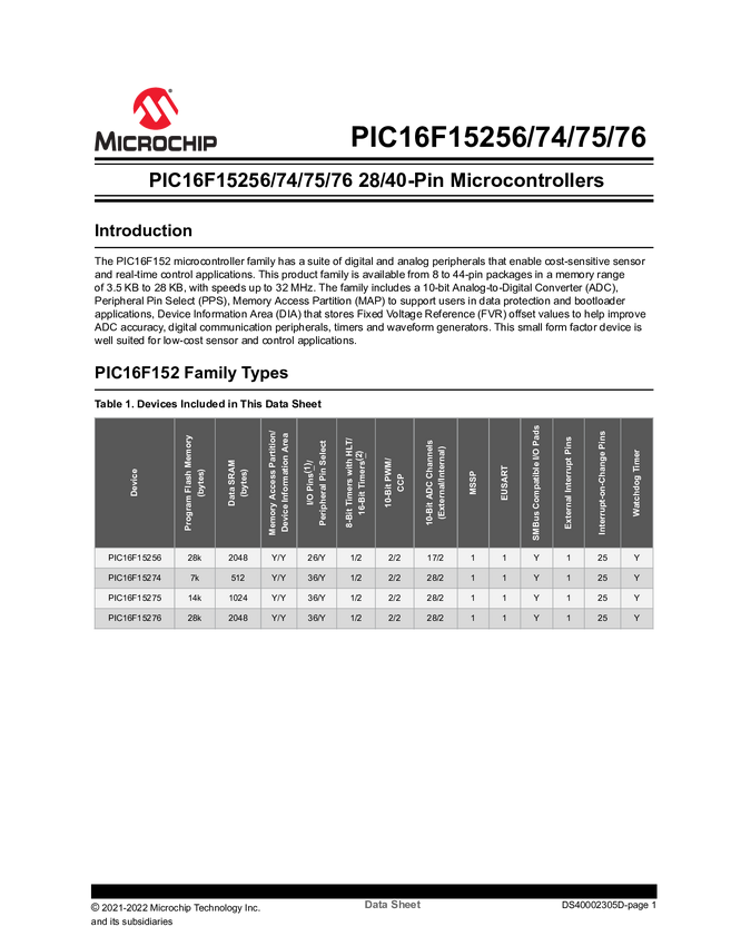 PIC16F15256/74/75/76 28/40-Pin Microcontrollers Data Sheet