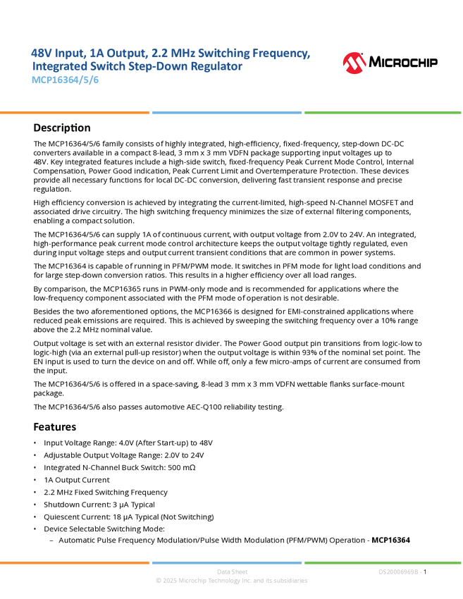 MCP16364/5/6 - 48V Input, 1A Output, 2.2 MHz Switching Frequency, Integrated Switch Step-Down Regulator