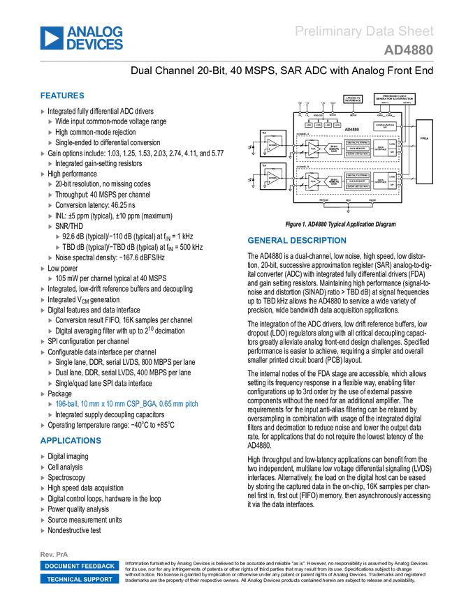 AD4880 Dual Channel 20-Bit, 40 MSPS, SAR ADC with Analog Front End