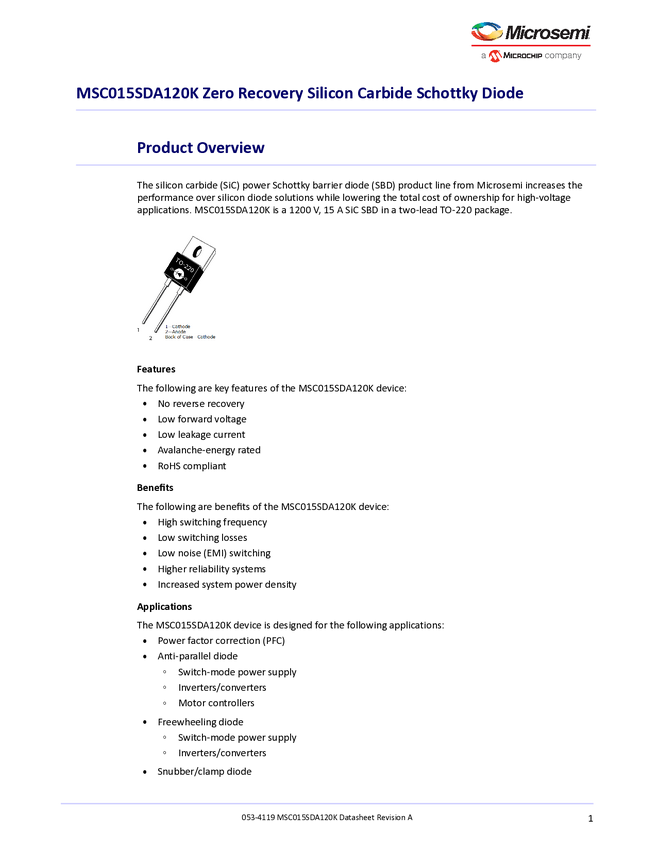 MSC015SDA120K SIC SBD 1200V 15A TO-220 Datasheet