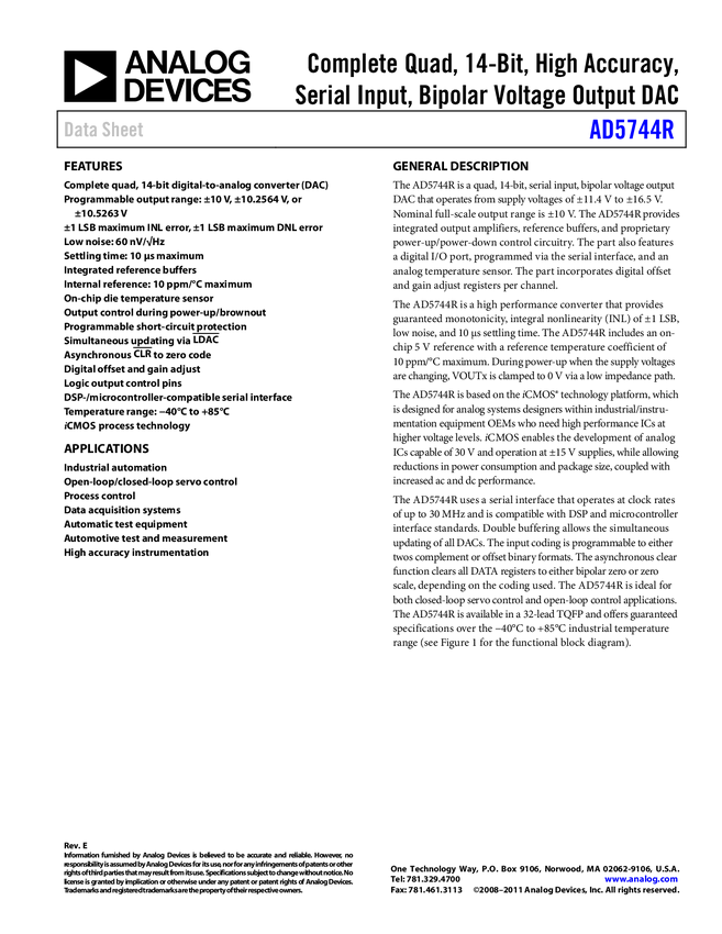 AD5744R Complete Quad, 14-Bit, High Accuracy, Serial Input, Bipolar Voltage Output...