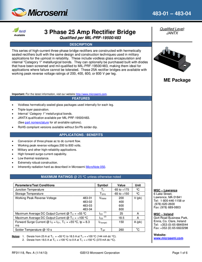 483 Series Three Pahse Bridge Rectifiers 483 Series_High Current Three Phase Bridge Rectifier