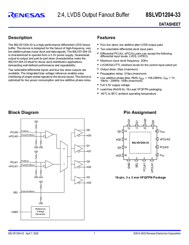 8SLVD1204-33NLGI 2:4, LVDS Output Fanout Buffer, 3.3V