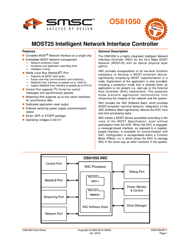 OS81050 MOST25 Intelligent Network Interface Controller Data Sheet