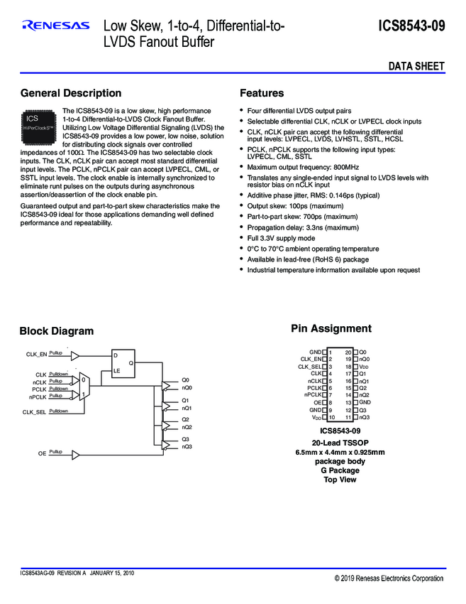 8543AG-09LF Low Skew,1-to-4 Differential-to-LVDS Fanout Buffer