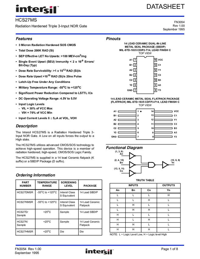 HCS27DMSR CMOS Triple 3-Input NOR Gate