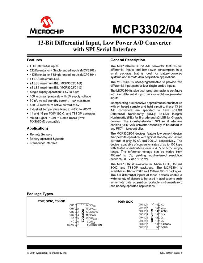 MCP3302/4 13-Bit Differential Input, Low Power A/D Converter with SPI Serail Int