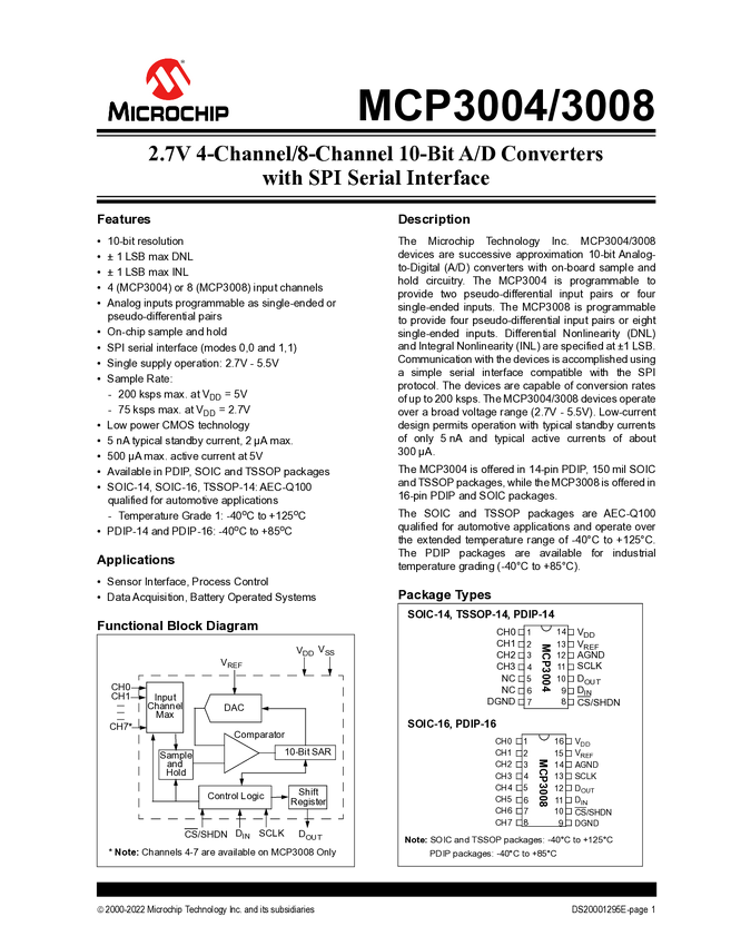MCP3004;MCP3008 2.7V 10-Bit A/D Converters with SPI Interface