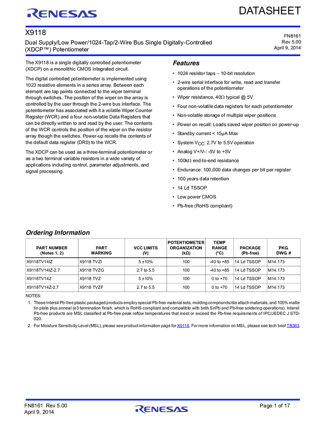 X9118TV14Z Dual Supply/Low Power/1024-Tap/2-Wire Bus Single Digitally-Controlled (XDCP...