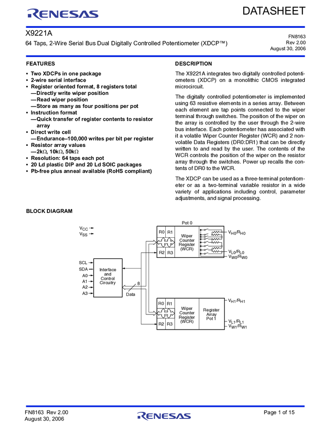 X9221AWSIZ Dual Digitally Controlled Potentiometer (XDCP™)