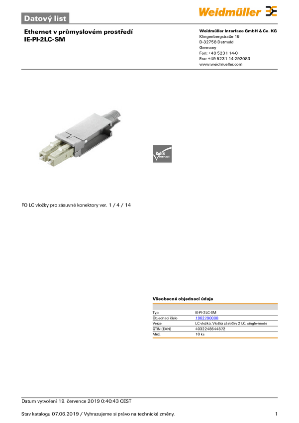 1962790000 Łącznik LWL, akcesoria Weidmüller IE-PI-2LC-SM 1962790000