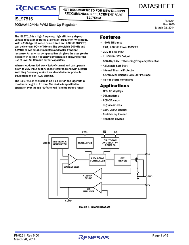 ISL97516IUZ-T 600kHz/1.2MHz PWM Step-Up Regulator