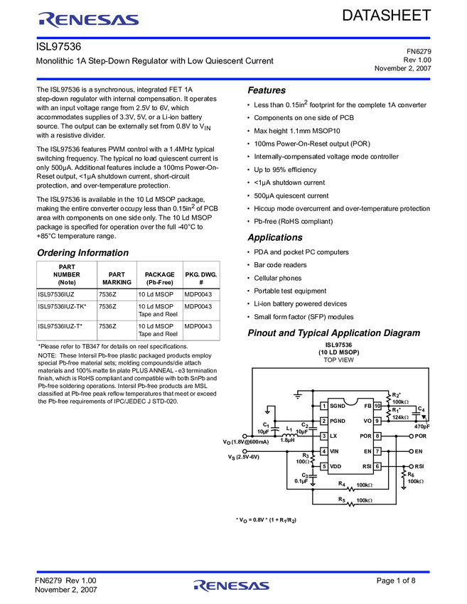 ISL97536IUZ Monolithic 1A Step-Down Regulator with Low Quiescent Current