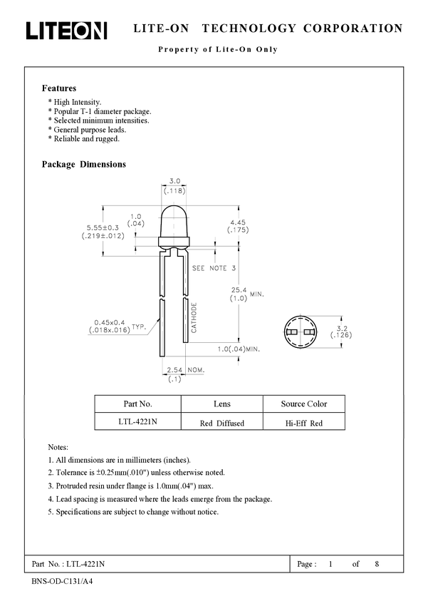 LTL4221N-022 Dioda LED THT Lite-On LTL4221N-022 LTL4221N-022, 3 mm, 8.7 mcd, 1 szt.