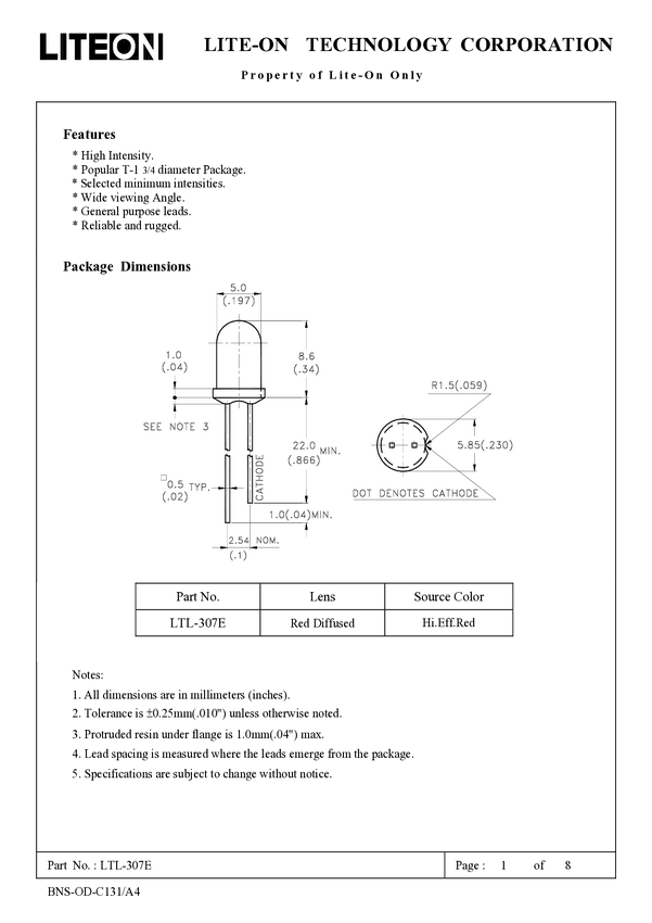 LTL307E Dioda LED THT Lite-On LTL307E LTL307E, 5 mm, 19 mcd, 1 szt.