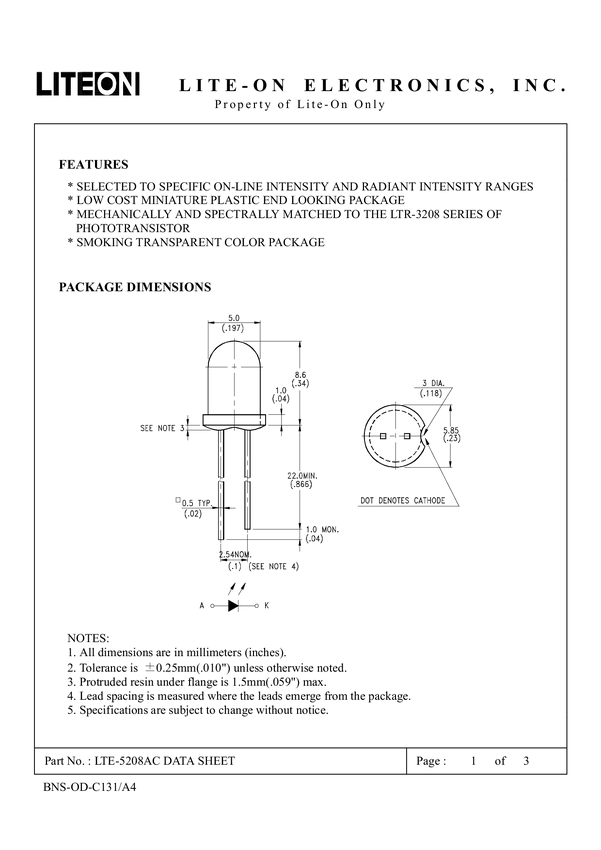 LTE5208AC Lite-On Dioda IR 940 nm 40 ° 5 mm radialny THD