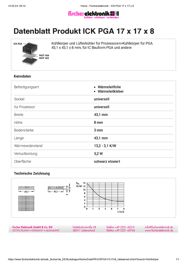 ICK PGA17X17X8 Fischer Elektronik ICK PGA17X17X8 ICK PGA17X17X8 Radiator 13.5 K/W (D x...