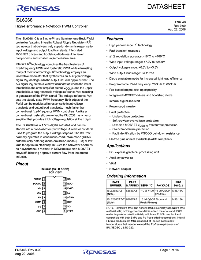 ISL6268CAZ High-Performance Notebook PWM Controller