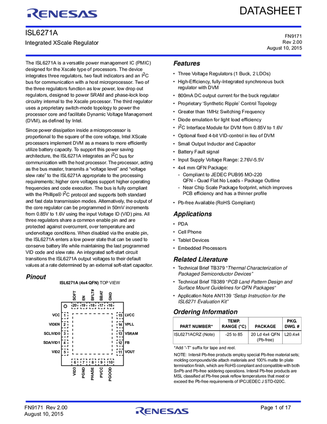 ISL6271ACRZ Integrated XScale Regulator