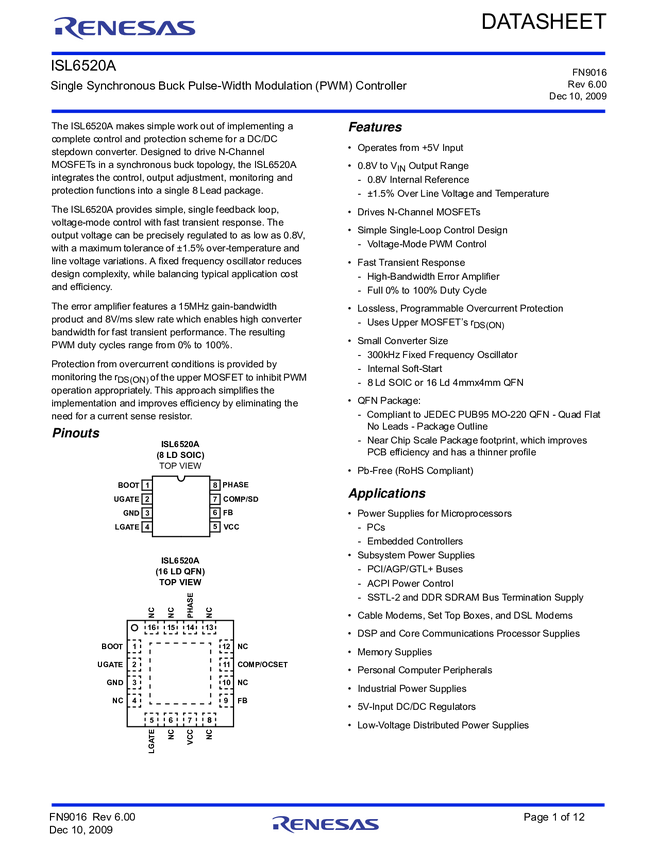 ISL6520ACBZA, ISL6520ACBZA-T, ISL6520ACBZ-T, ISL6520AIBZ, ISL6520AIBZ-T, ISL6520A