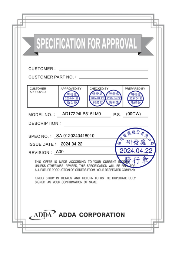Wentylator osiowy ADDA AD17224LB5151M0, 24 V/DC, 501.2 m³/h, (D x S x W) 172 x 150 x 51 mm