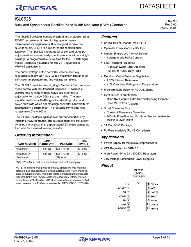 ISL6525CBZ Buck and Synchronous-Rectifier Pulse-Width Modulator (PWM) Controller