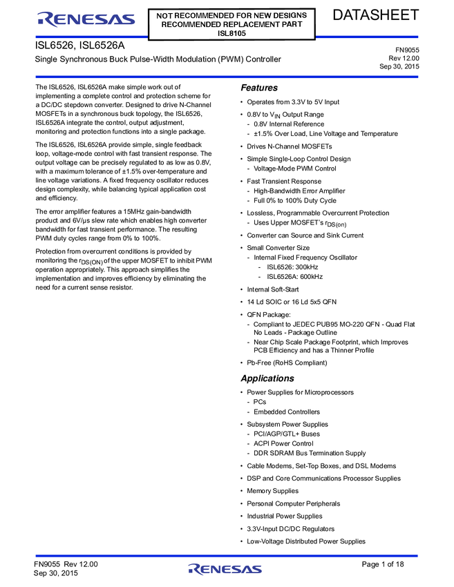 ISL6526AIRZ Single Synchronous Buck Pulse-Width Modulation (PWM) Controller
