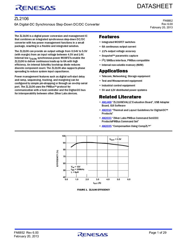 ZL2106ALCF 6A Digital-DC Synchronous Step-Down DC/DC Converter
