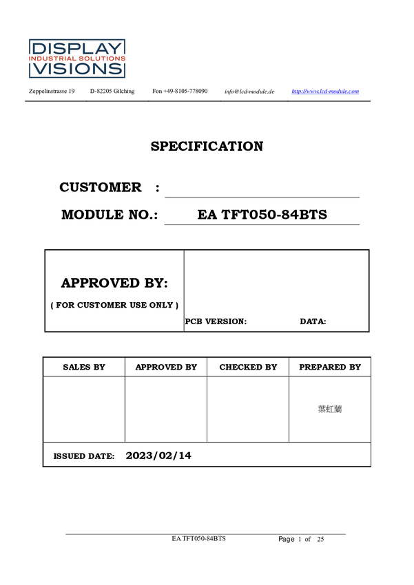 Wyświetlacz graficzny Display Elektronik EATFT050-84BTS biały 800 x 480 Pixel (S x W x G) 120.70 x 75.80 x 4.475 mm