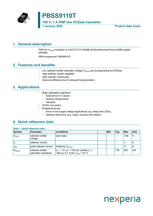 PBSS9110T Tranzystor; PBSS9110T; PNP; 1A; 100V; 300mW; SOT23; SMD; NEXPERIA; RoHS; op...