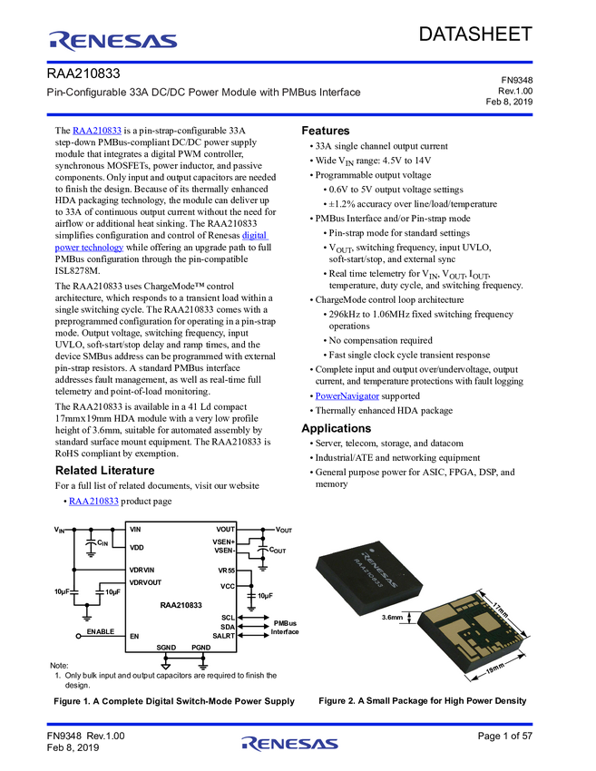 RAA2108332GLG#AG0 Pin-Configurable 33A DC/DC Power Module with PMBus Interface