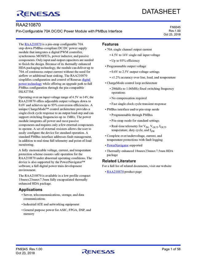 RAA2108702GLG#AG0 Pin-Configurable 70A DC/DC Power Module with PMBus Interface
