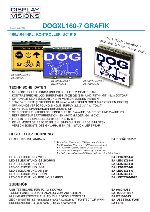 EADOGXL160E-7 Wyświetlacz graficzny Display Elektronik EADOGXL160E-7 (S x W x G) 78.00 x...