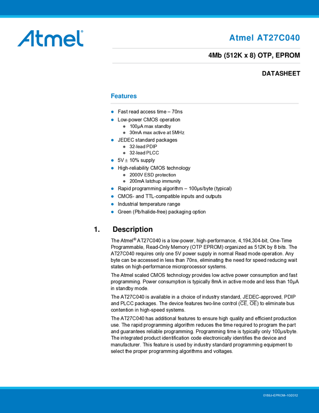 AT27C040-70PU Microchip Technology AT27C040-70PU Pamięć IC DIP-32 PROM 4.096 MBit 512 K x...