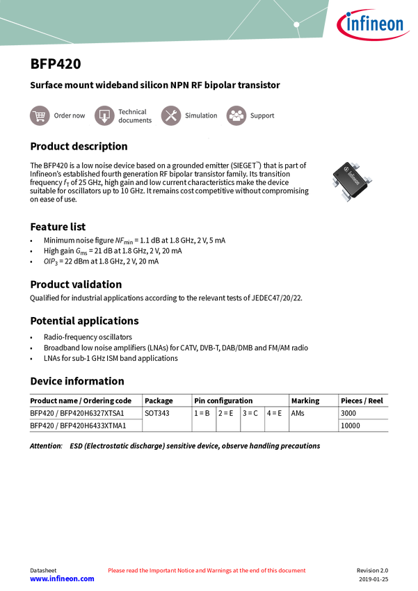 BFP420H6327XTSA1 Infineon Technologies BFP420H6327XTSA1 Tranzystor (BJT) - dykretny 1 szt.