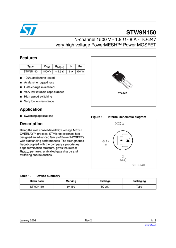 STW9N150 MOSFET STMicroelectronics STW9N150 N/A N/A