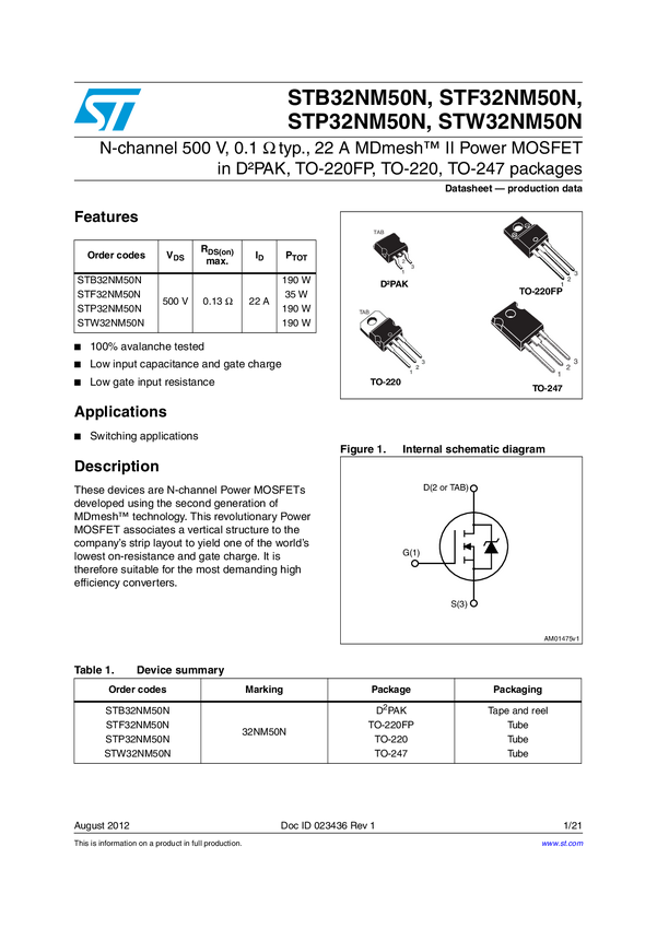 STW32NM50N MOSFET STMicroelectronics STW32NM50N N/A N/A