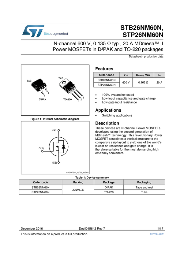 MOSFET STMicroelectronics STP26NM60N N/A N/A