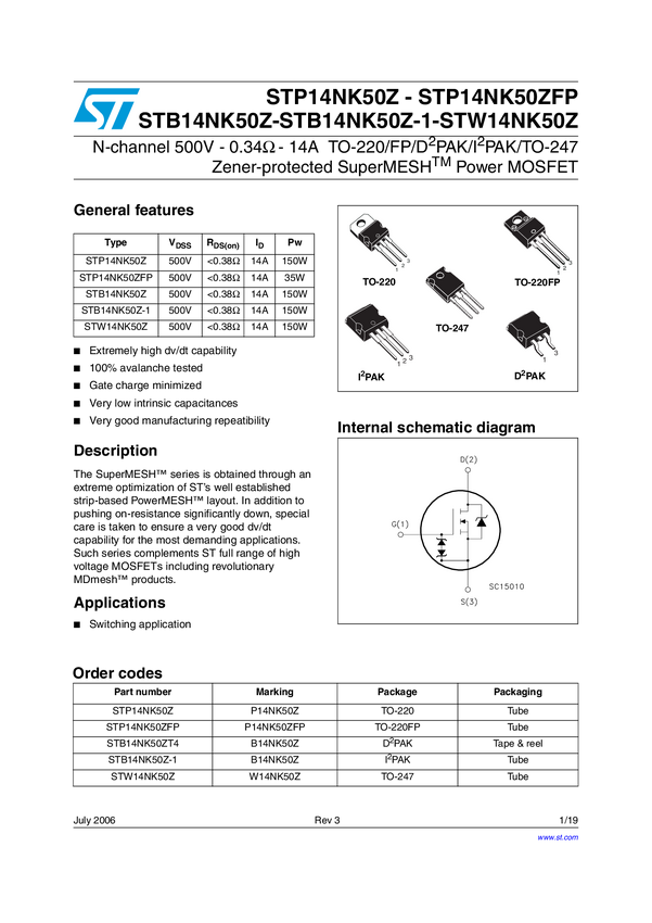 MOSFET STMicroelectronics STP14NK50Z N/A N/A
