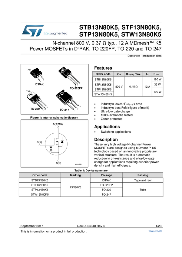 MOSFET STMicroelectronics STP13N80K5 N/A N/A