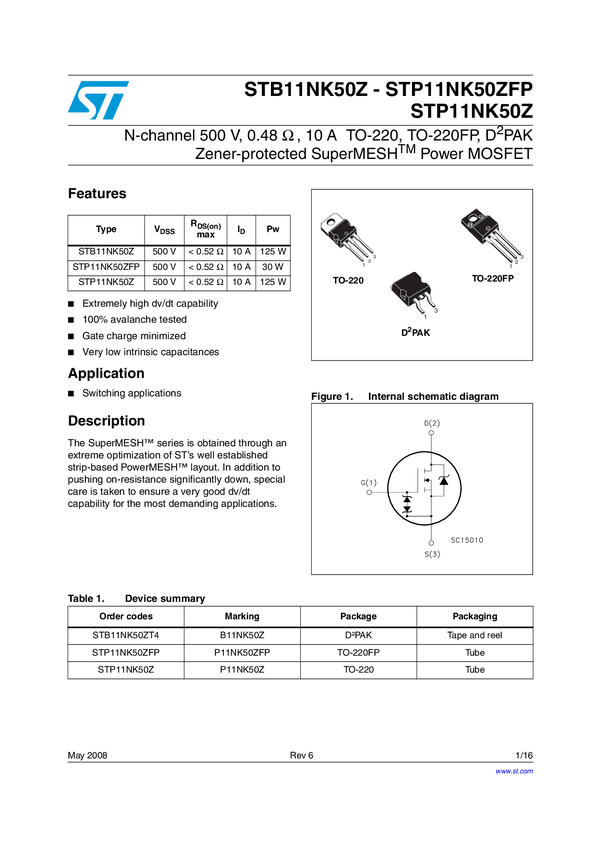 MOSFET STMicroelectronics STP11NK50Z N/A N/A