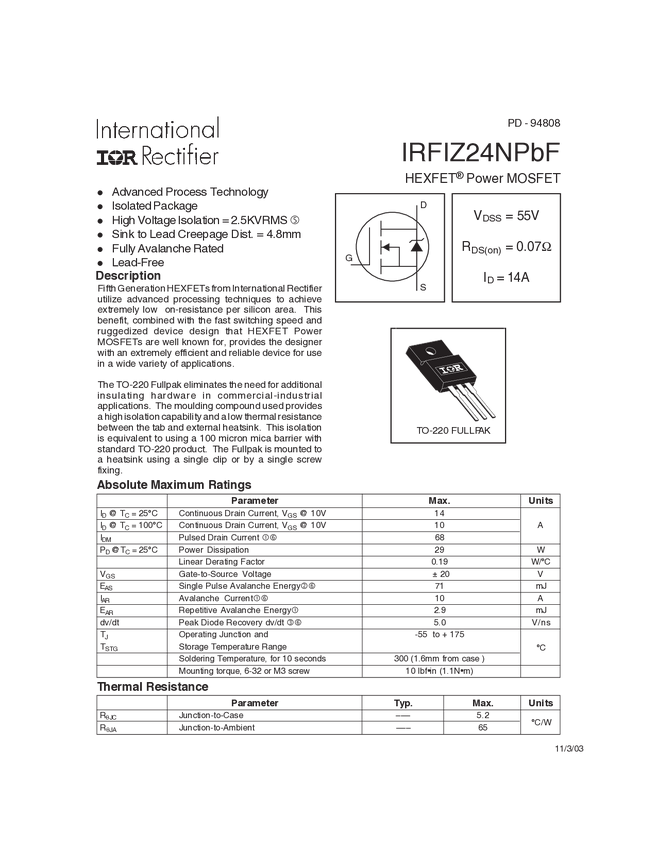 IRFIZ24NPBF MOSFET Infineon Technologies IRFIZ24NPBF N/A N/A IRFIZ24NPBF